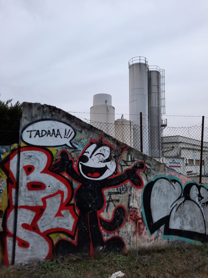 C’est moins beau à mon avis, mais est-ce que l’artiste est responsable ? Non, lui a cherché à embellir et à animer un environnement urbain manifestement inesthétique (sauf peut-être au regard de quelque architecte industriel misanthrope).