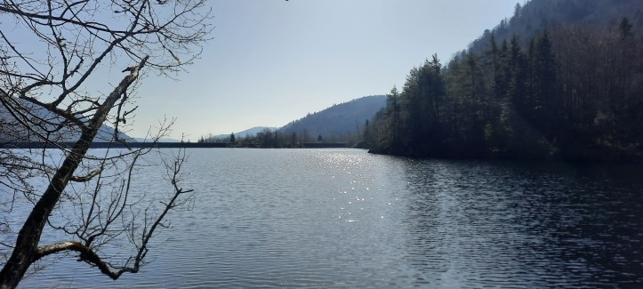 Avec le soleil qui se reflète sur les eaux du lac c’est particulièrement joli. On est le matin, il est environ onze heures.