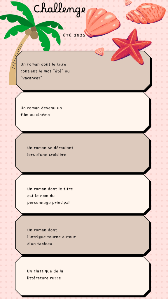 Nous voici donc repartis pour le challenge de l’été. N’hésitez pas à me conseiller des romans qui remplissent les critères, je serai ravi de les découvrir.